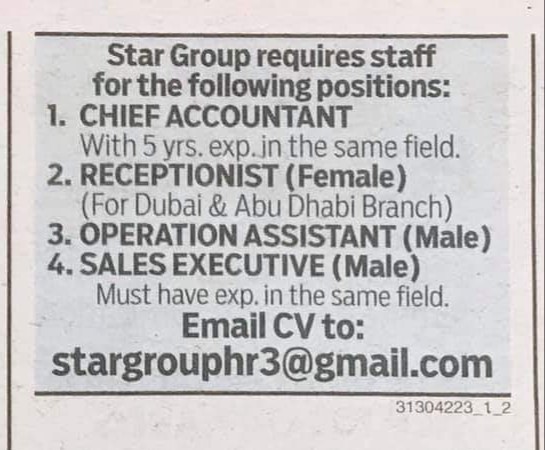 مطلوب موظفون استقبال وموظفون مبيعات للعمل لدى وظائف مجموعة ستار بالامارات بالإضافة غلى شواغر وظيفية أخرى يمكنكم الاطلاع عليها من خلال نسخة من الاعلان الاصلي المنشور بتاريخ اليوم في الخليج تايمز، والتواصل مع صاحب العمل على الايميل الوارد بالاعلان.